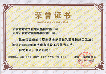 • 2020年度济南市建设腾博888官网诚信优异工法《旋挖钻全护筒钻孔灌注桩施工工法》